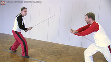 Die Bindung mit der Klinge bietet dir zusätzlichen Schutz, falls dein Schritt zu langsam oder zu kurz erfolgt. Sie verhindert außerdem die Bedrohung durch einen eventuell auf den Hau folgenden Stich aus dem langen Ort
