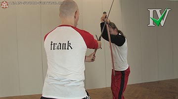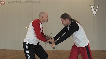 Das alternative Ende arbeitet stark mit dem Prinzip "Fühlen am Schwert". Statt wie in "Das erste Stück" mit einem flüssigen Umschnappen zur gegenüberliegenden Blöße (Kopf) mit anschließendem Abzug zu arbeiten, wird in diesem Stück dem Druck des Gegners nachgefolgt - und wir fallen dem Gegner über sein Schwert auf die Arme.