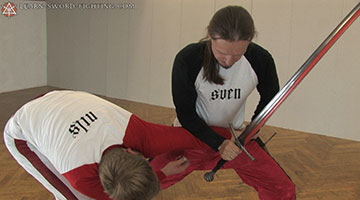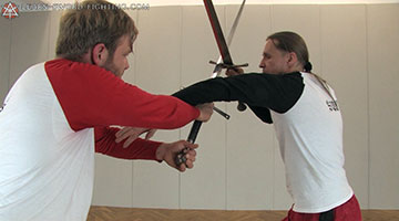 Half-swording (Halbes Schwert / Kurzes Schwert) calls for the fencer to grip his/her longsword with one hand at the handle and the other hand shifted to the blade (or even both hands) to wield it somewhat like a spear, pollaxe, or mace, whether for defence or offence.
