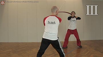 Das alternative Ende arbeitet stark mit dem Prinzip "Fühlen am Schwert". Statt wie in "Das erste Stück" mit einem flüssigen Umschnappen zur gegenüberliegenden Blöße (Kopf) mit anschließendem Abzug zu arbeiten, wird in diesem Stück dem Druck des Gegners nachgefolgt - und wir fallen dem Gegner über sein Schwert auf die Arme.
