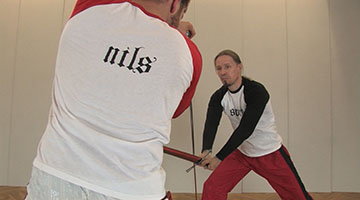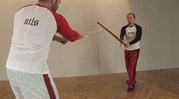 Das Winden in die unteren Blößen eignet sich als Konter gegen Fechter, die gerne Stiche zum Kopf oder zur Brust führen. In diesem Video werden die oberen Ziele vom Gegner mit einem hohen Stich angegriffen.
