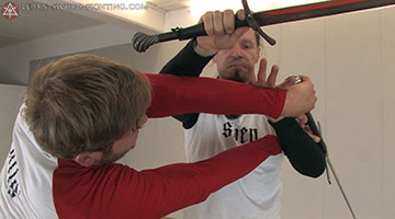 Half-swording (Halbes Schwert / Kurzes Schwert) calls for the fencer to grip his/her longsword with one hand at the handle and the other hand shifted to the blade (or even both hands) to wield it somewhat like a spear, pollaxe, or mace, whether for defence or offence.